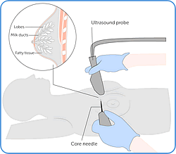 This test is usually performed under ultrasound guidance and requires insertion of a small needle through the skin into the breast lump.